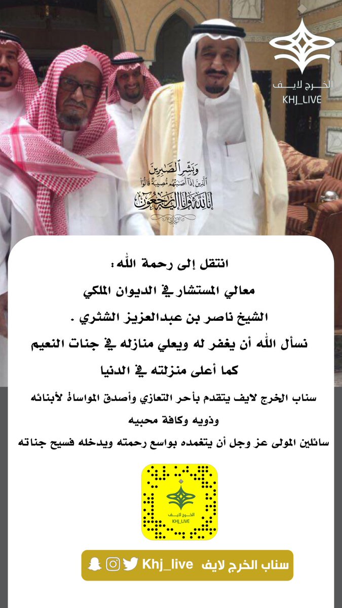 Ù Ù ÙÙ Ø§ÙØ´ÙØ® ÙØ§ØµØ± Ø§ÙØ´Ø«Ø±Ù from www.chahidvip.com دار البشائر الإسلامية، صفحة 39، 41، 43. By الشيخ عبدالعزيز بن ابراهيم القاسم. وأمه هي الجوهرة بنت عبدالعزيز بن مسعد الجلوي. انتقل إلى رحمة الله تعالى والدي الغالي معالي الشيخ ناصر الشثري تغمده. توفي قبل قليل المستشار في الديوان الملكي الشيخ الدكتور ناصر بن عبدالعزيز أبو حبيب الشثري. وذكر نجل الراحل، أحمد الشثري، عبر حسابه في موقع تويتر: وعلق الأمير عبدالرحمن بن مساعد على خبر وفاة الشثري بتغريدة قال فيها: أعلنت عائلة المستشار في الديوان الملكي السعودي، الشيخ ناصر بن عبدالعزيز الشثري، المعروف بـمستشار الملوك، عن وفاته مساء الخميس بعد صراع مع المرض.